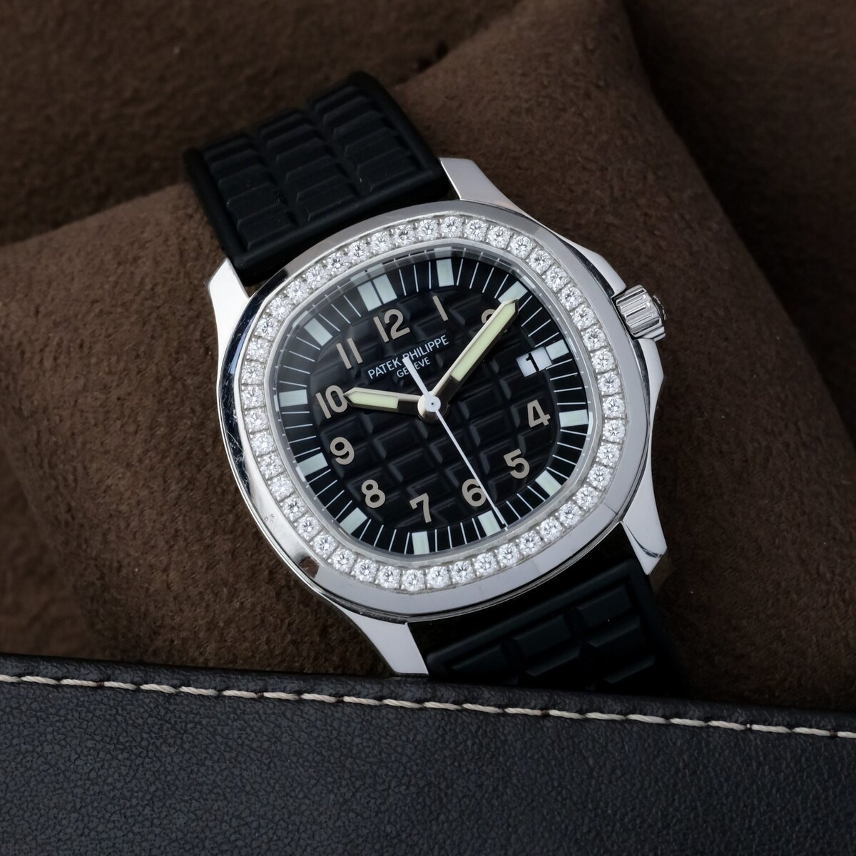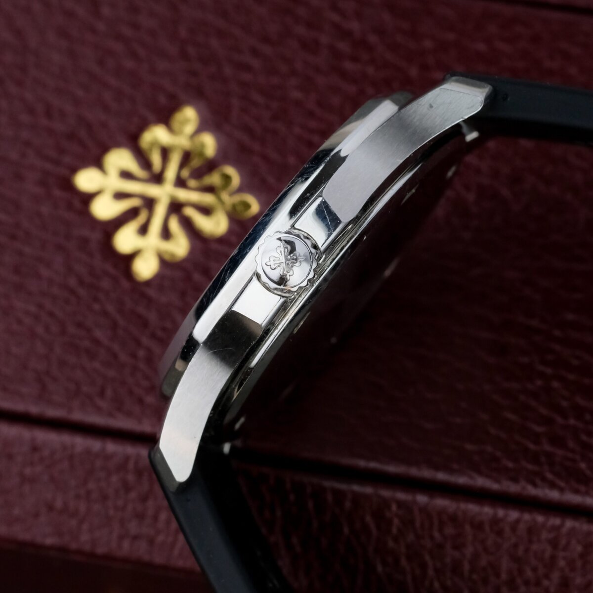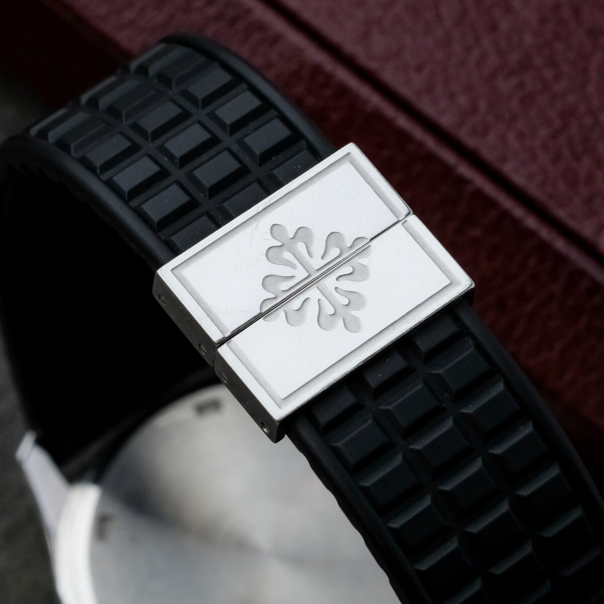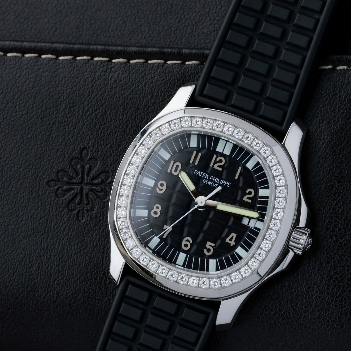 The black embossed dial features applied Arabic numerals, luminous hands and a matching rubber strap that complements the watch’s dynamic character. Powered by a precise quartz movement, it offers effortless reliability and everyday practicality while maintaining Patek Philippe’s hallmark refinement.