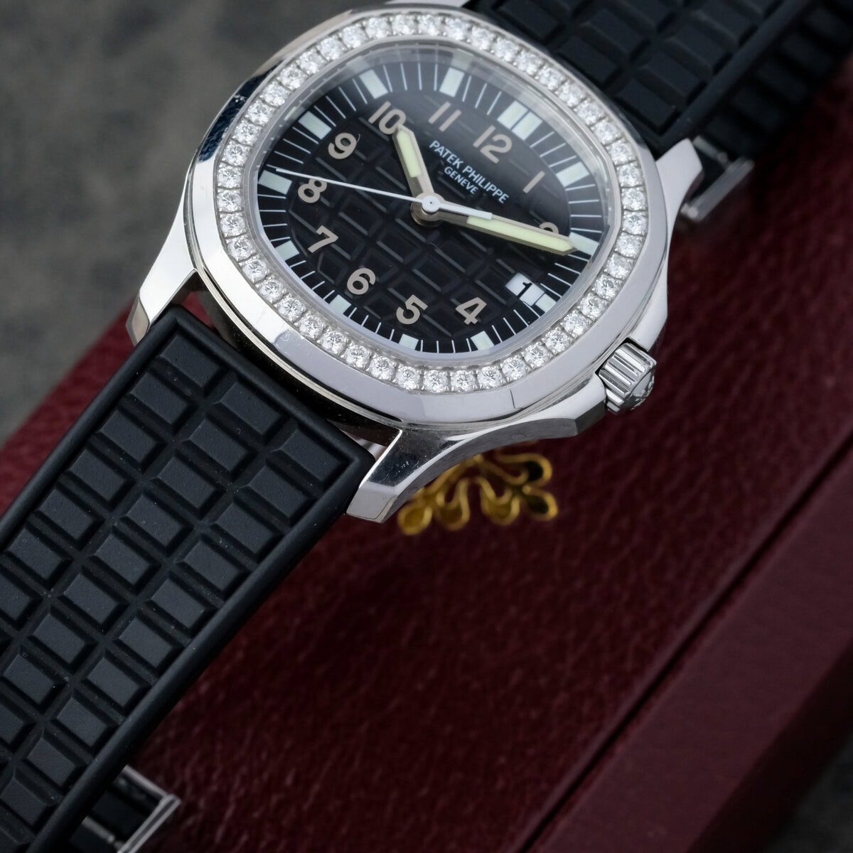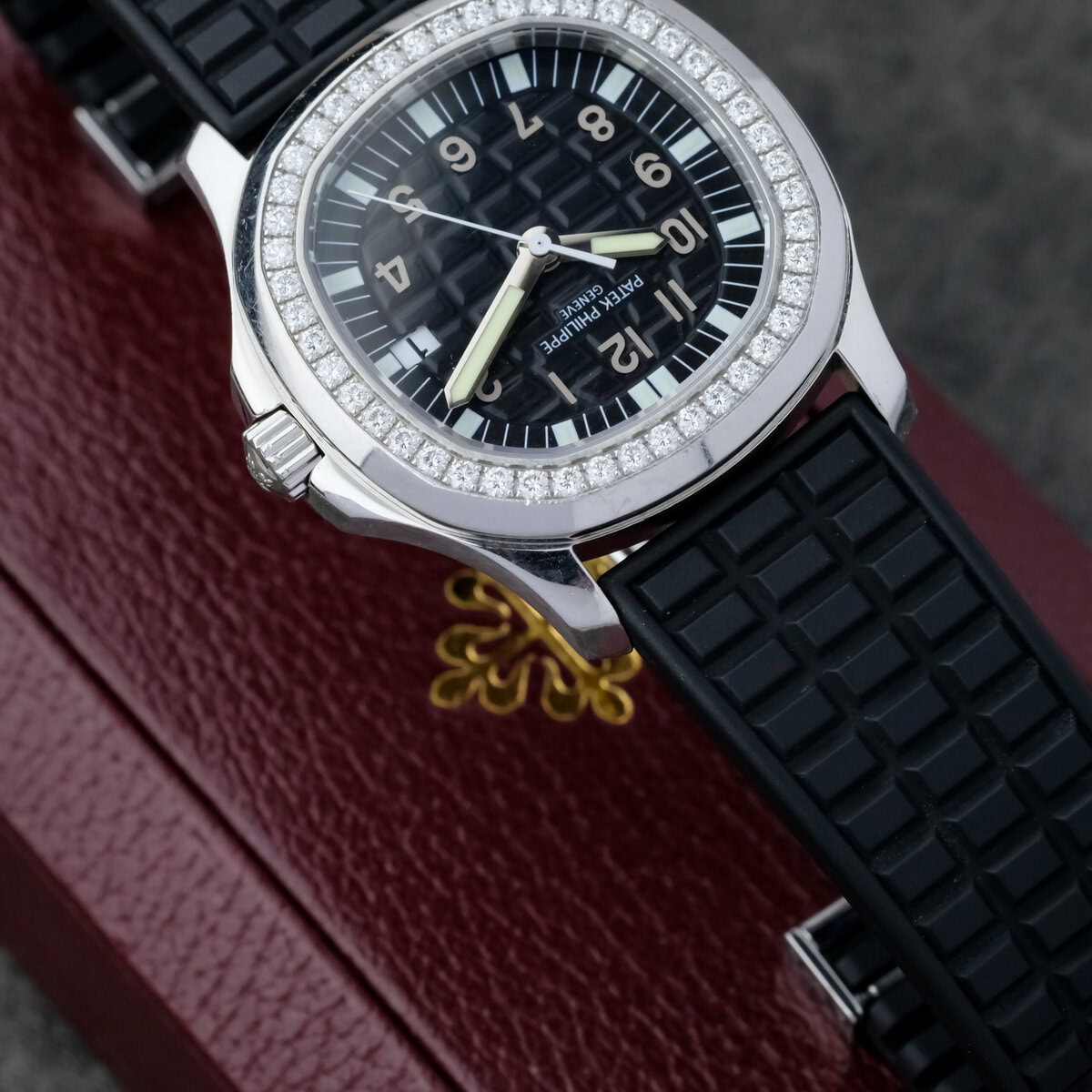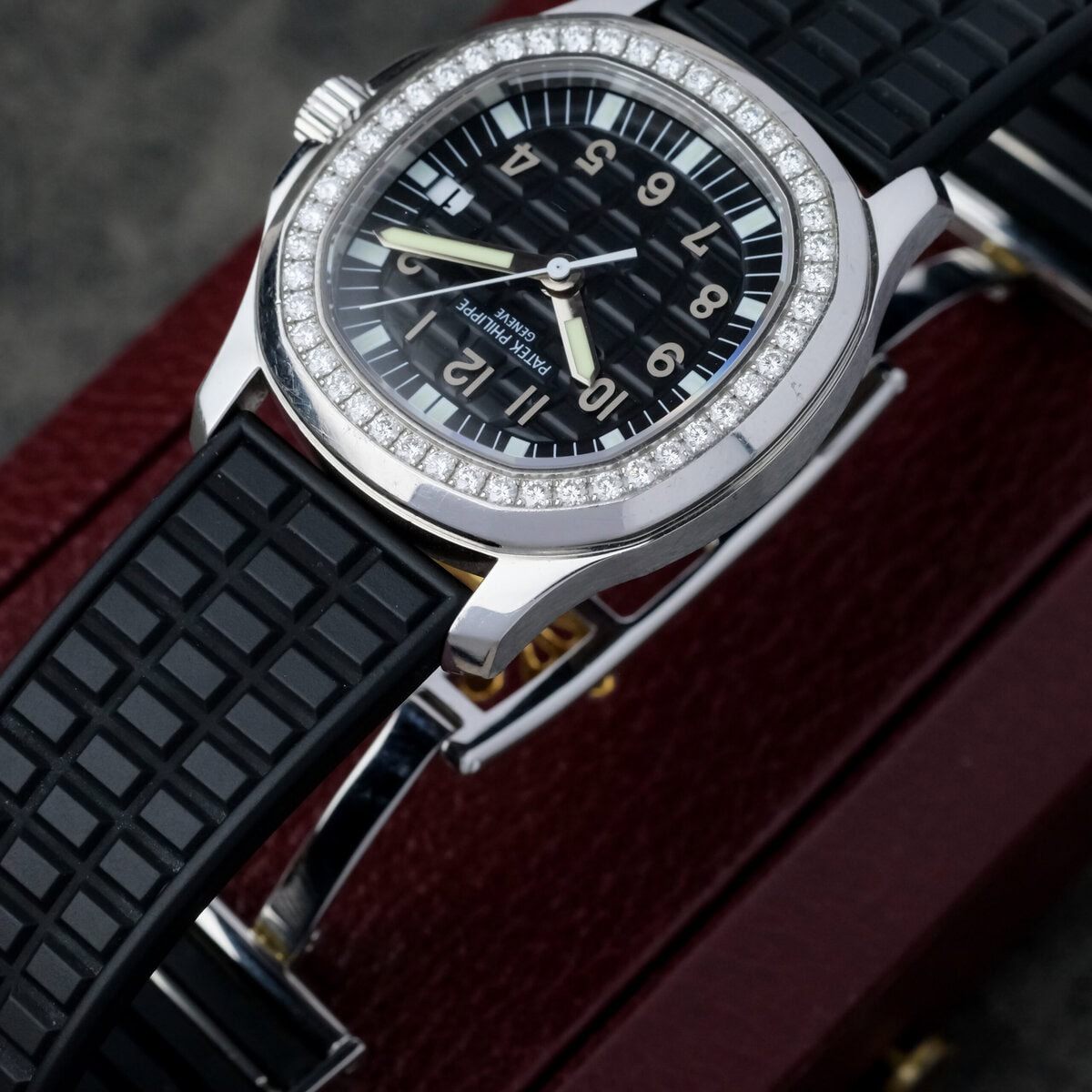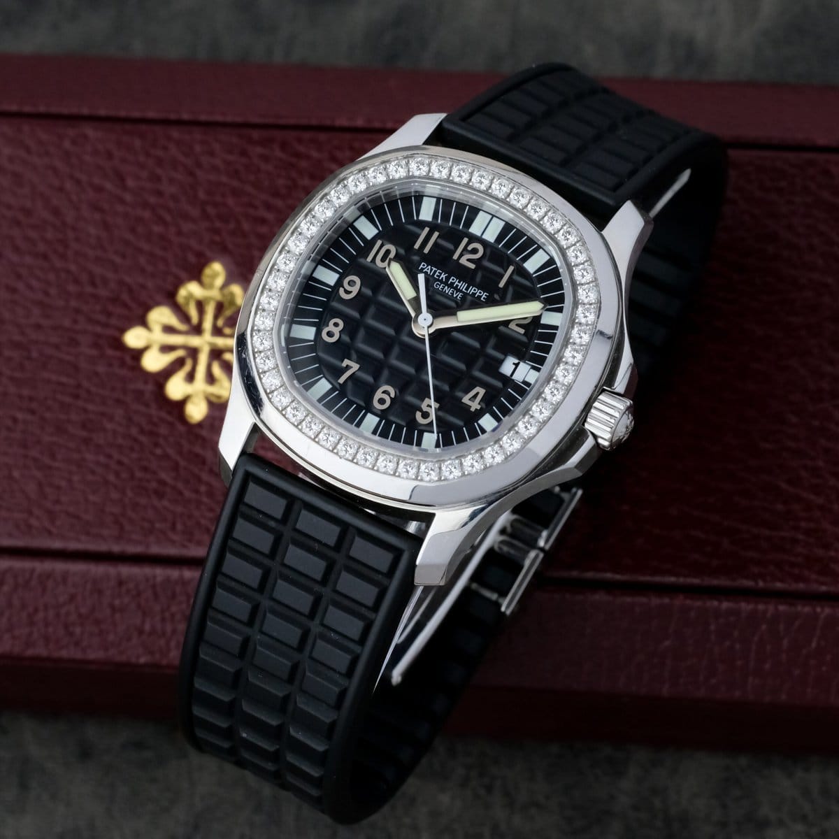 The black embossed dial features applied Arabic numerals, luminous hands and a matching rubber strap that complements the watch’s dynamic character. Powered by a precise quartz movement, it offers effortless reliability and everyday practicality while maintaining Patek Philippe’s hallmark refinement.