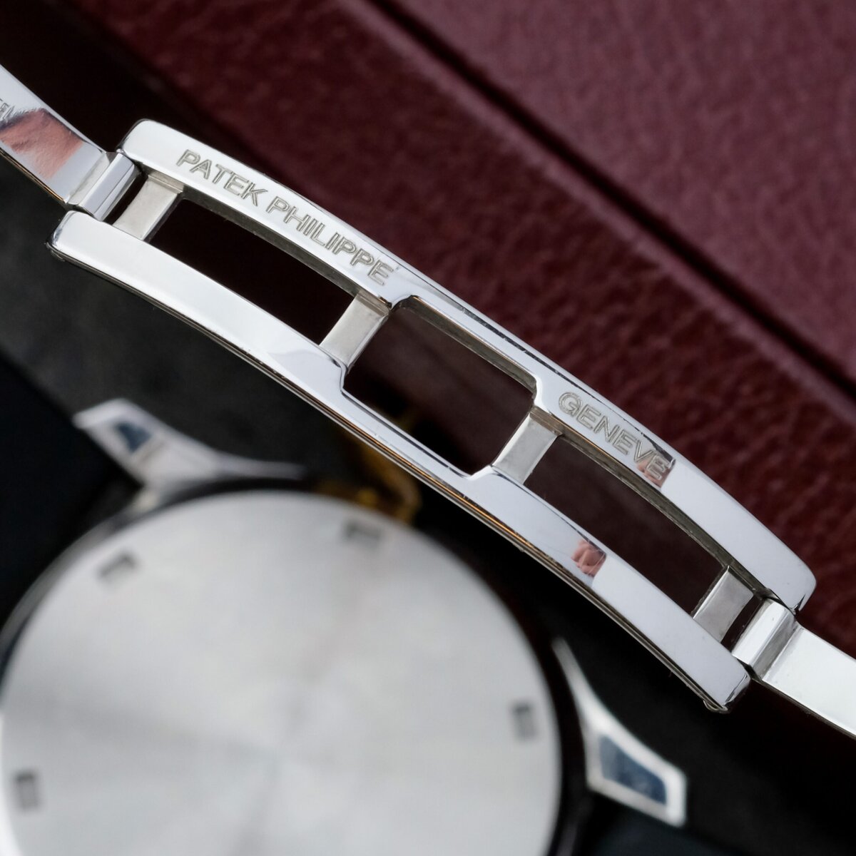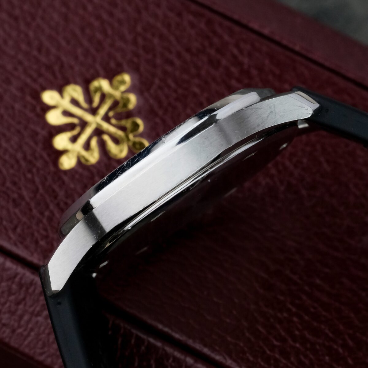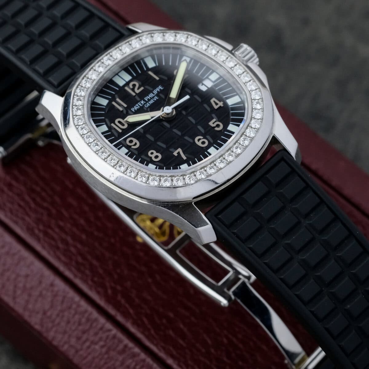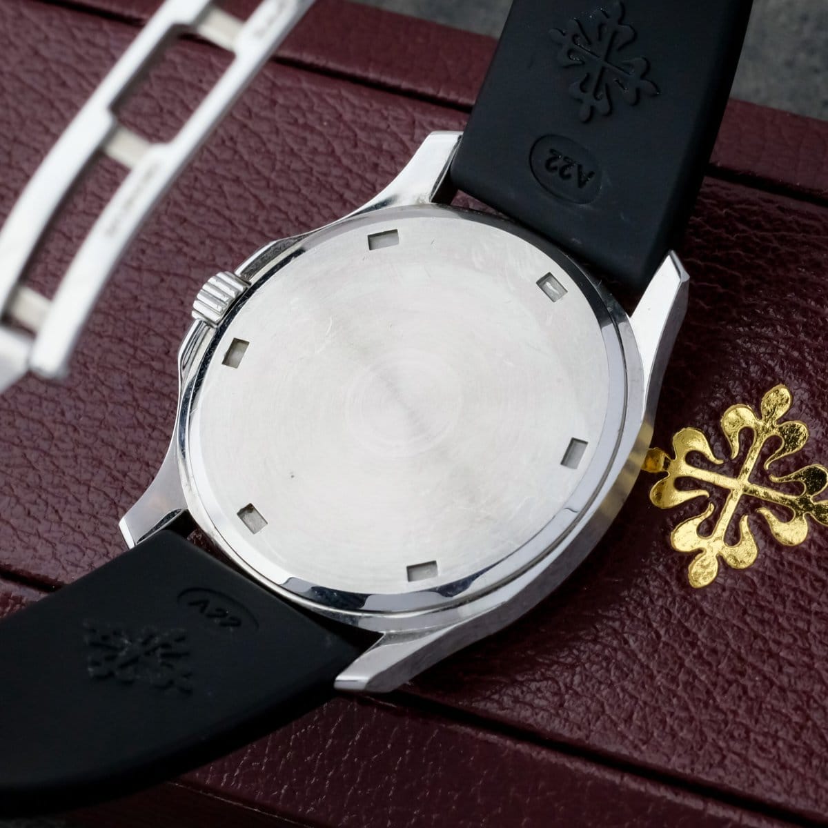 The black embossed dial features applied Arabic numerals, luminous hands and a matching rubber strap that complements the watch’s dynamic character. Powered by a precise quartz movement, it offers effortless reliability and everyday practicality while maintaining Patek Philippe’s hallmark refinement.