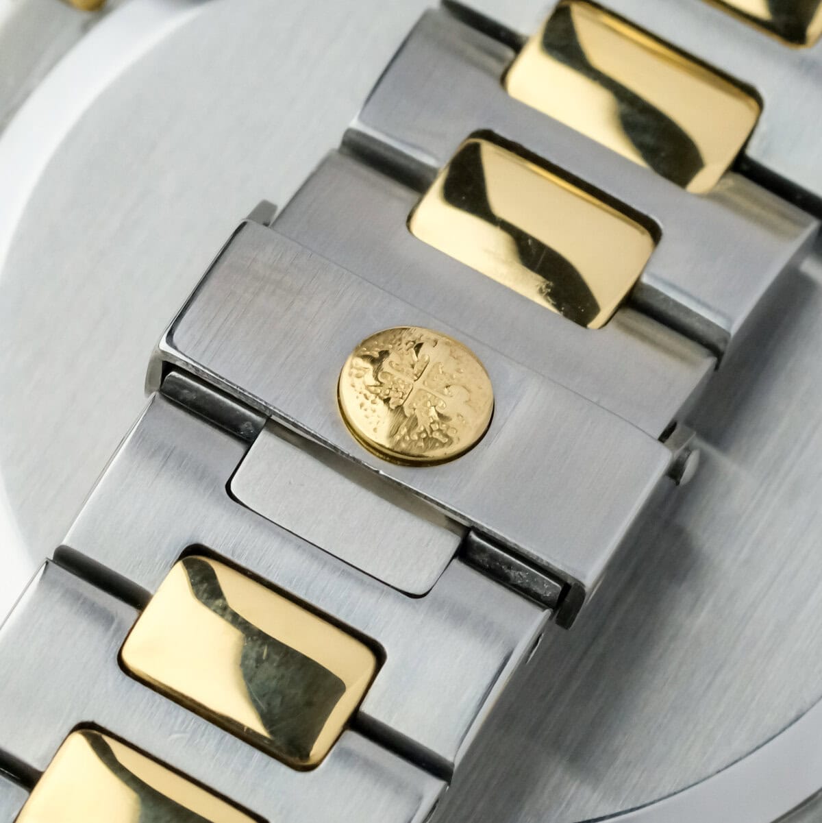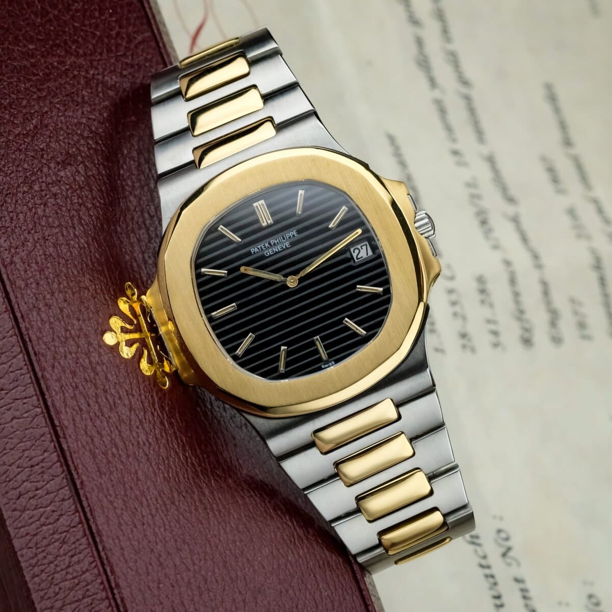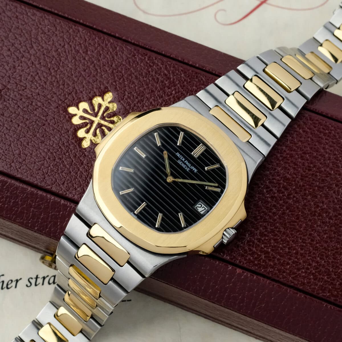 The integrated case and bracelet, flawlessly alternating between brushed steel and solid gold, give the watch its unmistakable Nautilus character, sporty yet effortlessly elegant. The striking black dial, with its horizontal embossing, applied gold hour markers and perfectly framed date window at 3 o’clock, captures the understated luxury that has made this model a cult classic among collectors.