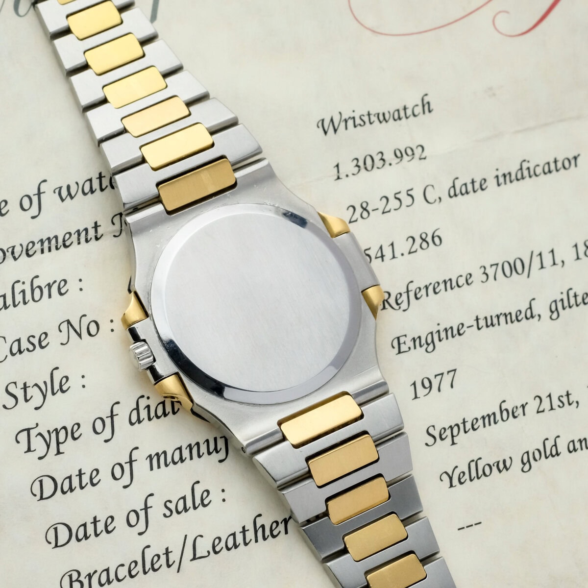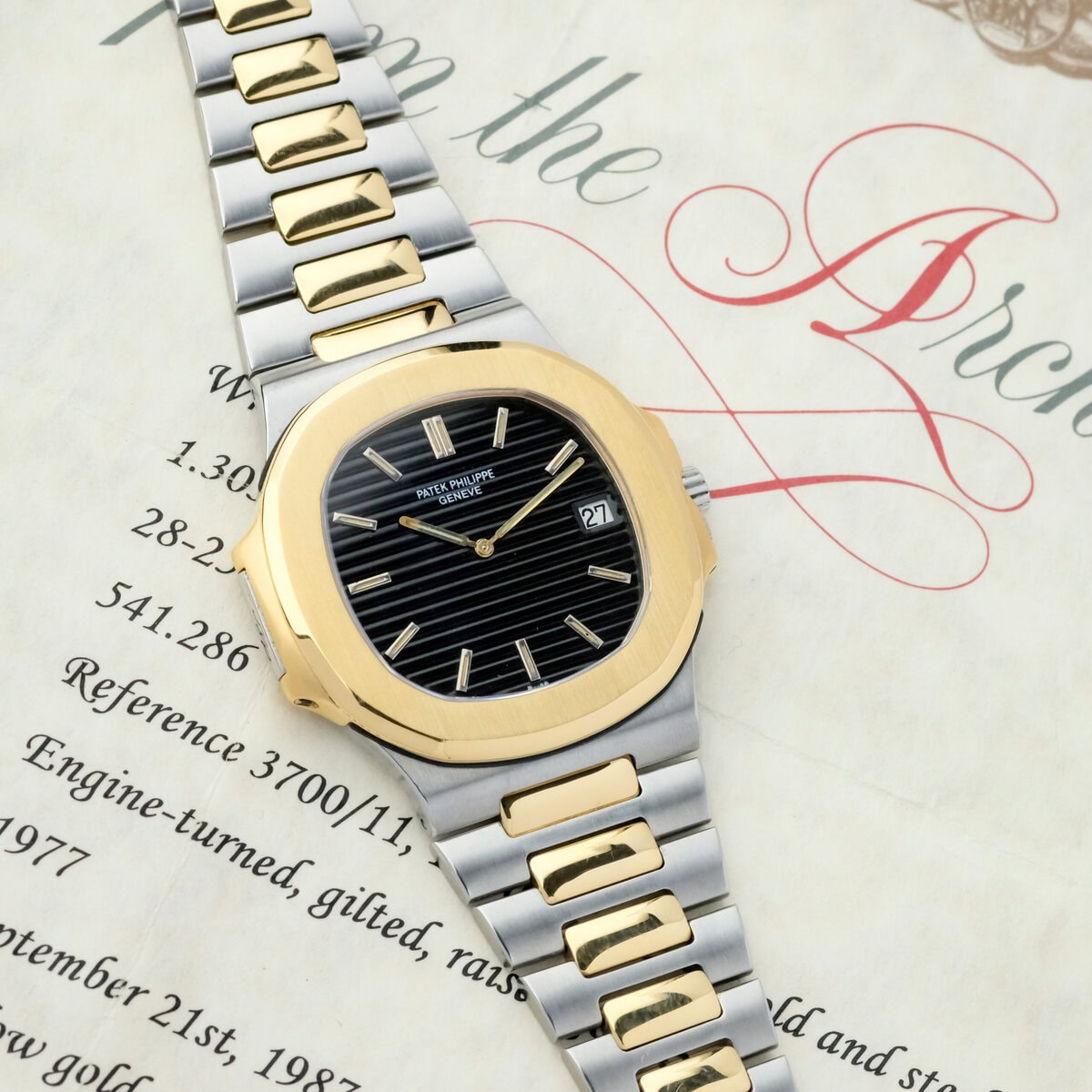 An icon of 20th century watchmaking, the legendary Patek Philippe Nautilus reference 3700, here in the highly coveted steel and 18k yellow gold configuration, powered by the renowned automatic calibre 28-255 C. Produced in 1977 during the earliest years of Nautilus history and sold a full decade later in 1987, this example represents a rare opportunity to own one of the most significant and hard-to-find executions of this Gérald Genta masterpiece.