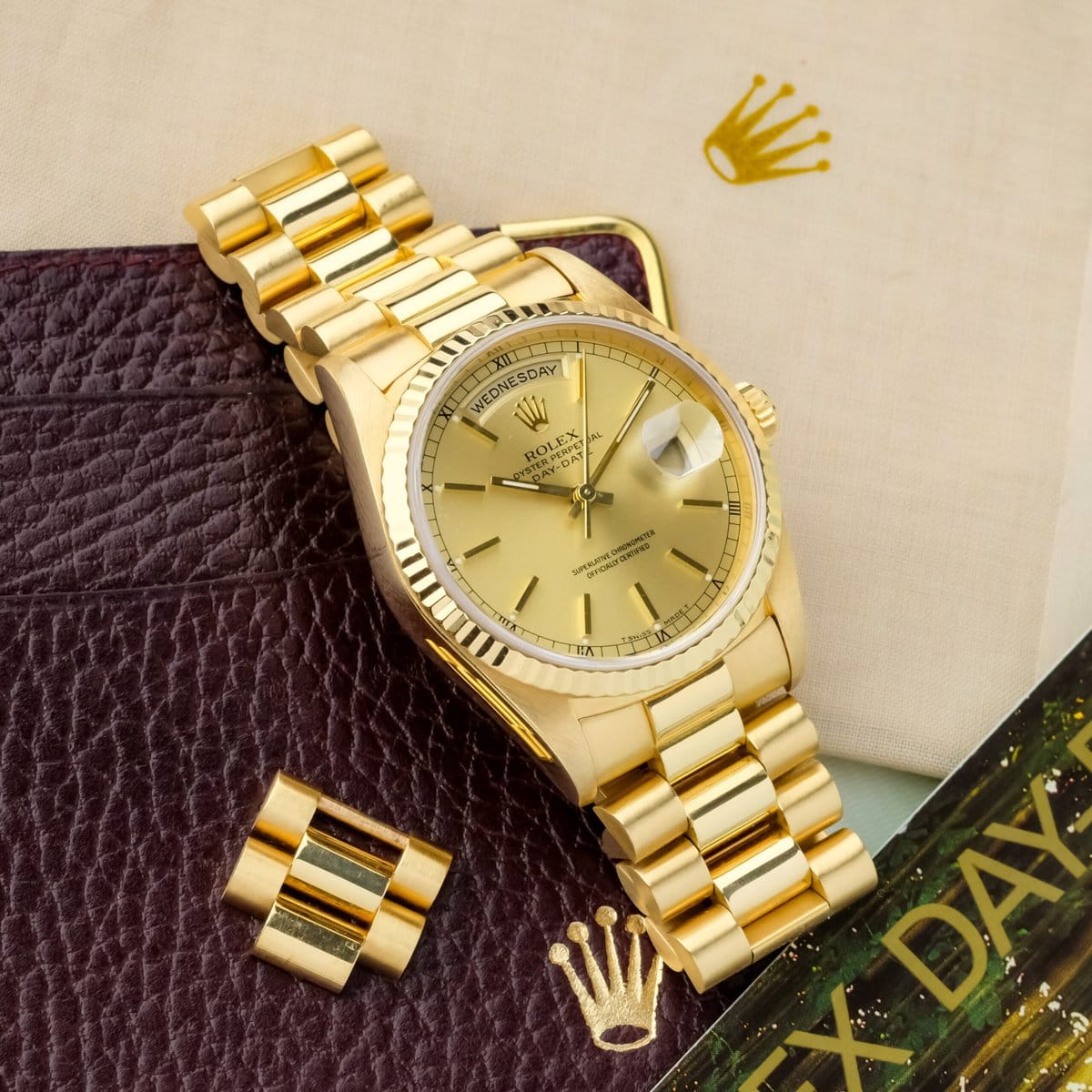 The champagne dial, complemented by applied hour markers and the signature day and date windows, exudes timeless sophistication. Powered by Rolex’s automatic caliber featuring the double quick set function, it offers both precision and everyday practicality.