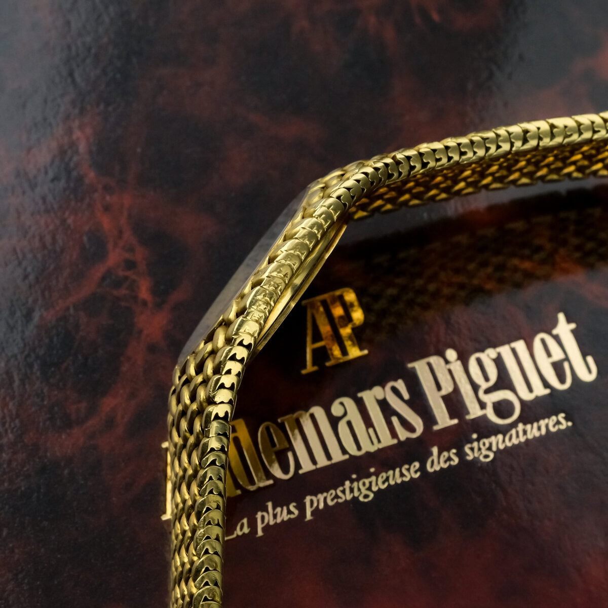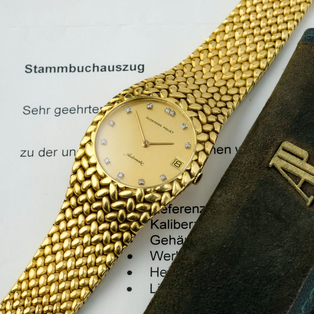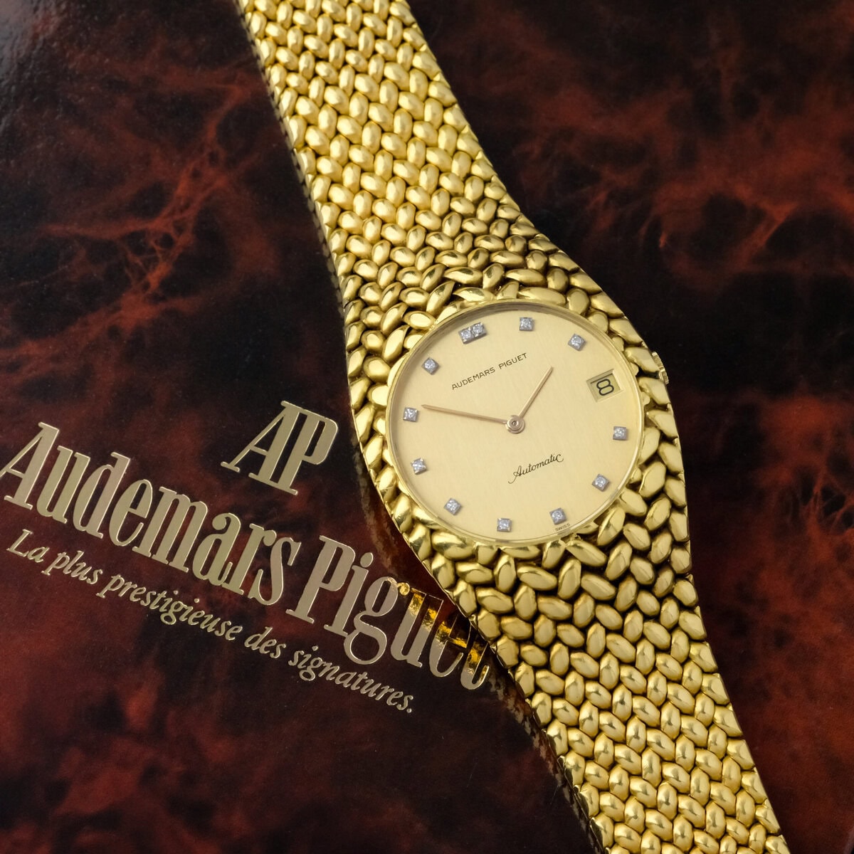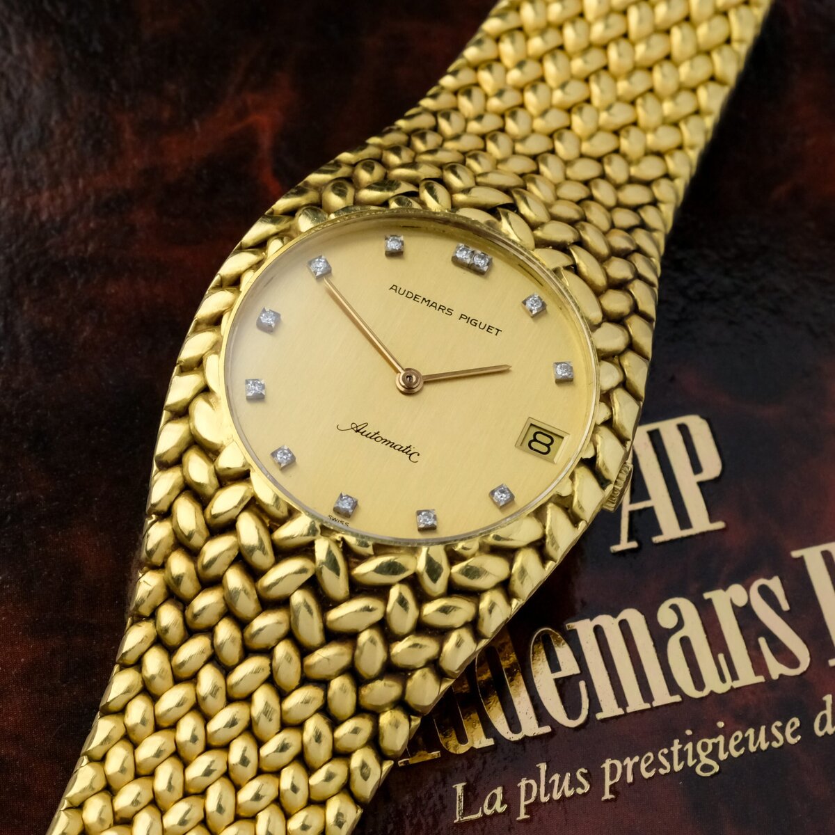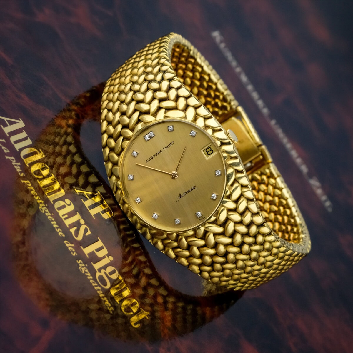 Das goldene Zifferblatt mit Sonnenschliff und diamantbesetzten Indizes verleiht dieser ultraseltenen Referenz einen Hauch von raffinierter Opulenz und bewahrt gleichzeitig die für AP typische Eleganz. Angetrieben von einem hochpräzisen Automatikwerk, verbindet die Uhr technische Exzellenz mit markanter Ästhetik.