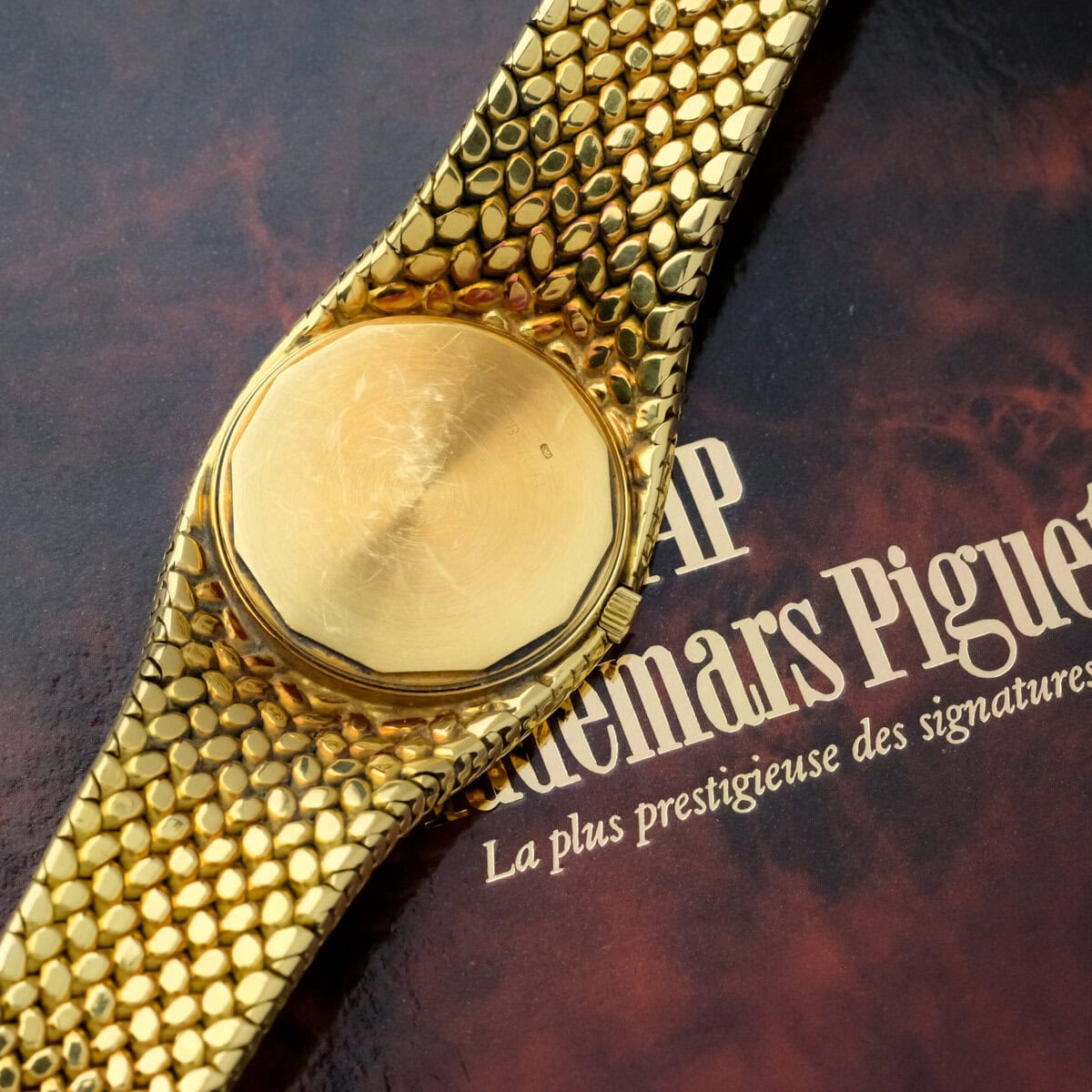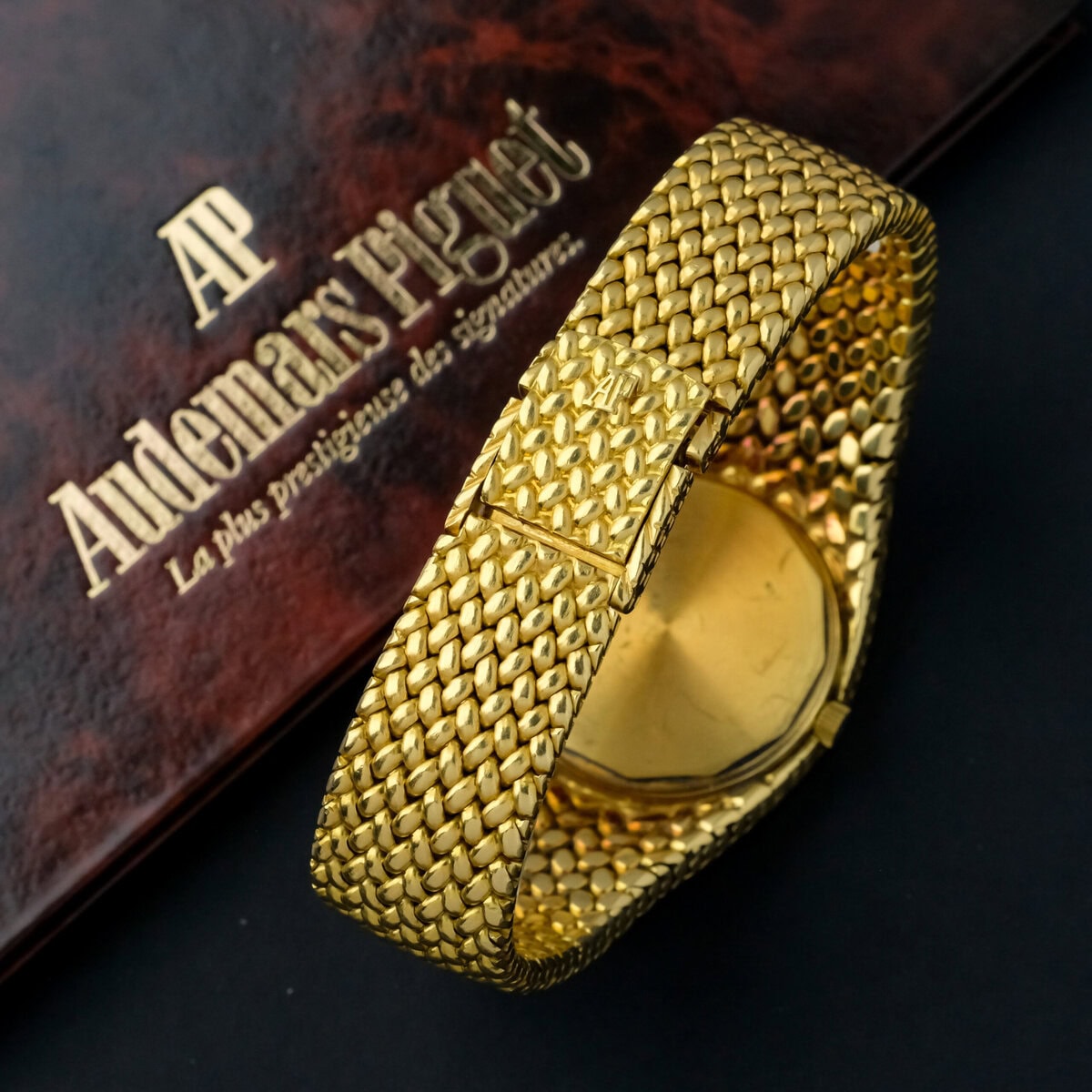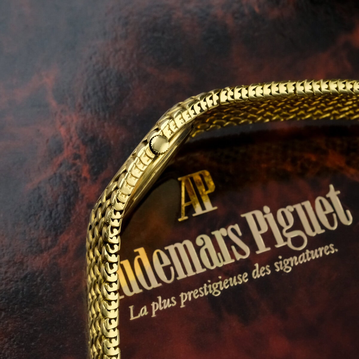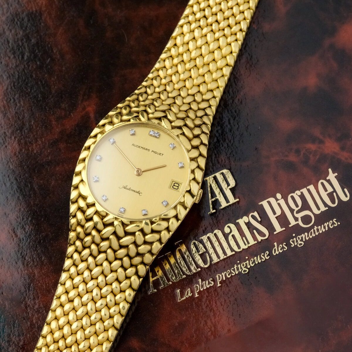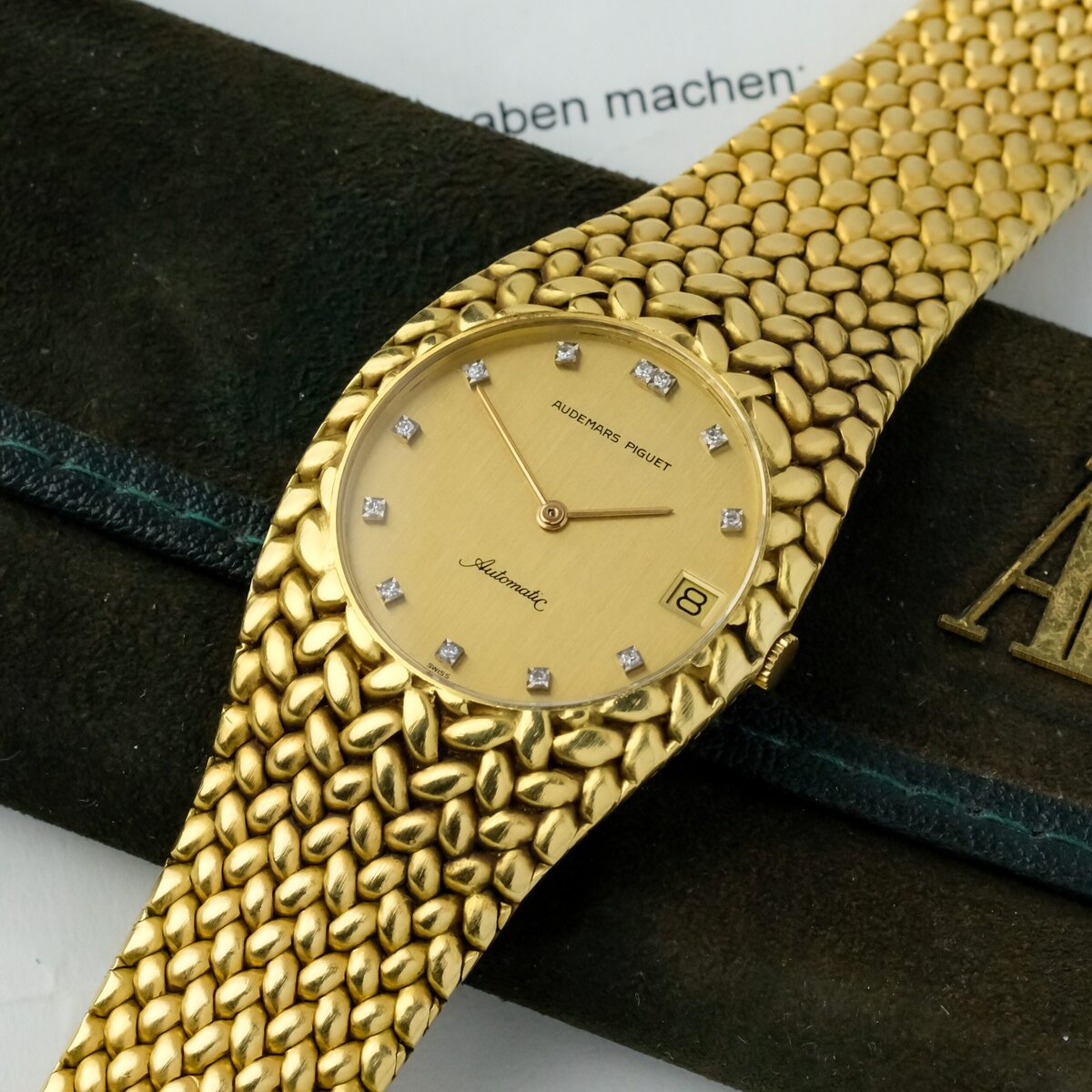 Das goldene Zifferblatt mit Sonnenschliff und diamantbesetzten Indizes verleiht dieser ultraseltenen Referenz einen Hauch von raffinierter Opulenz und bewahrt gleichzeitig die für AP typische Eleganz. Angetrieben von einem hochpräzisen Automatikwerk, verbindet die Uhr technische Exzellenz mit markanter Ästhetik.