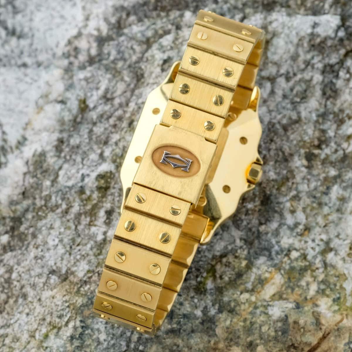 This Cartier Santos Carrée reference 2960 in 18k yellow gold with an exceptionally rare natural stone ferrite dial is truly an unusual find. The dial is in perfect condition with no cracks, maintaining its original deep texture and unique metallic sheen. Ferrite dials are among the rarest configurations for the Carrée line and are highly sought after by collectors.