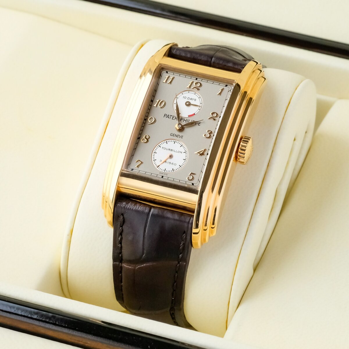 Patek Philippe Grand Complication reference 5101R 001 in 18k rose gold, measuring 29.6 by 51.7 millimeters and powered by a hand wound movement with a ten day power reserve. The long rectangular case follows the characteristic Art Deco inspired design of the reference and features a sapphire display back showcasing the tourbillon on the reverse of the movement.