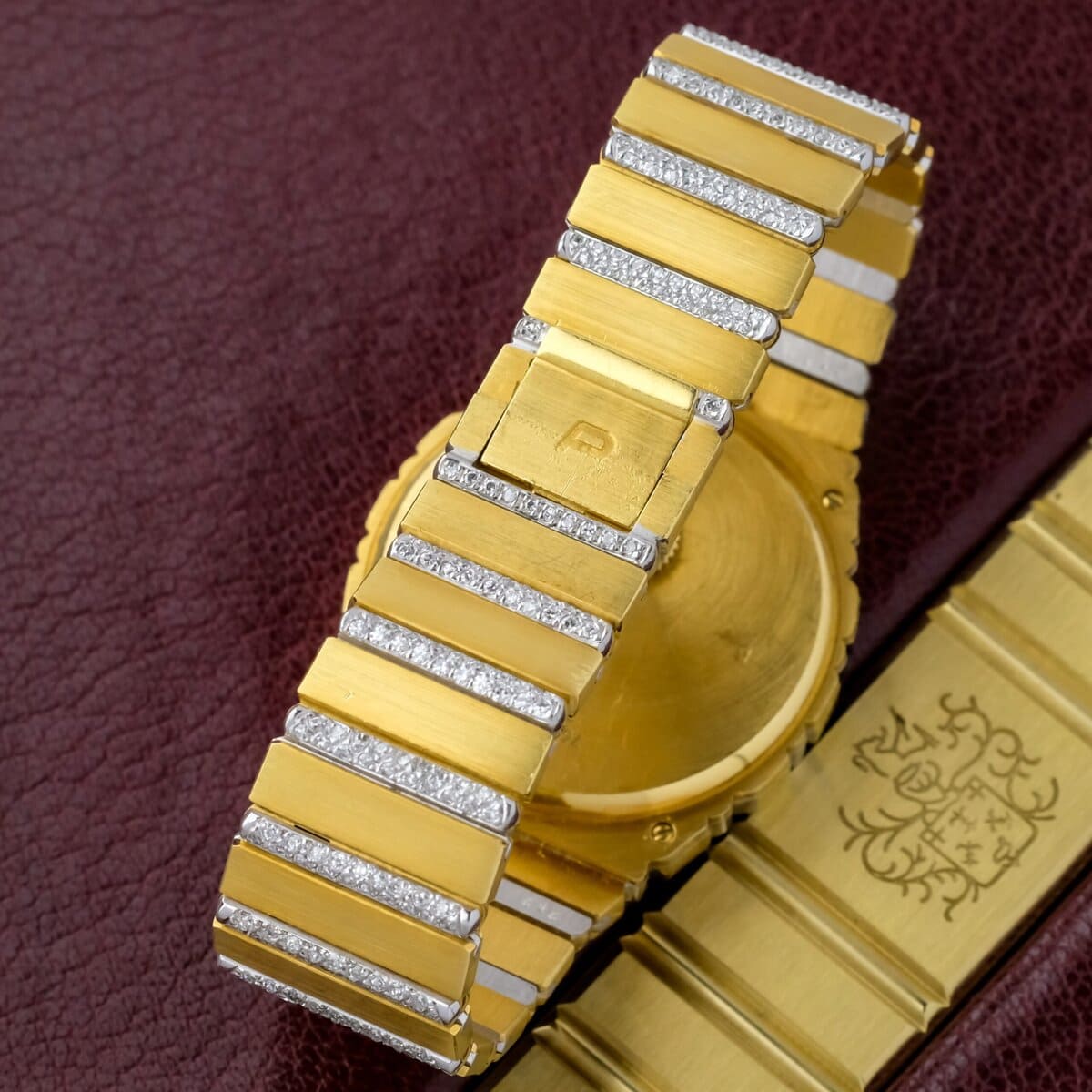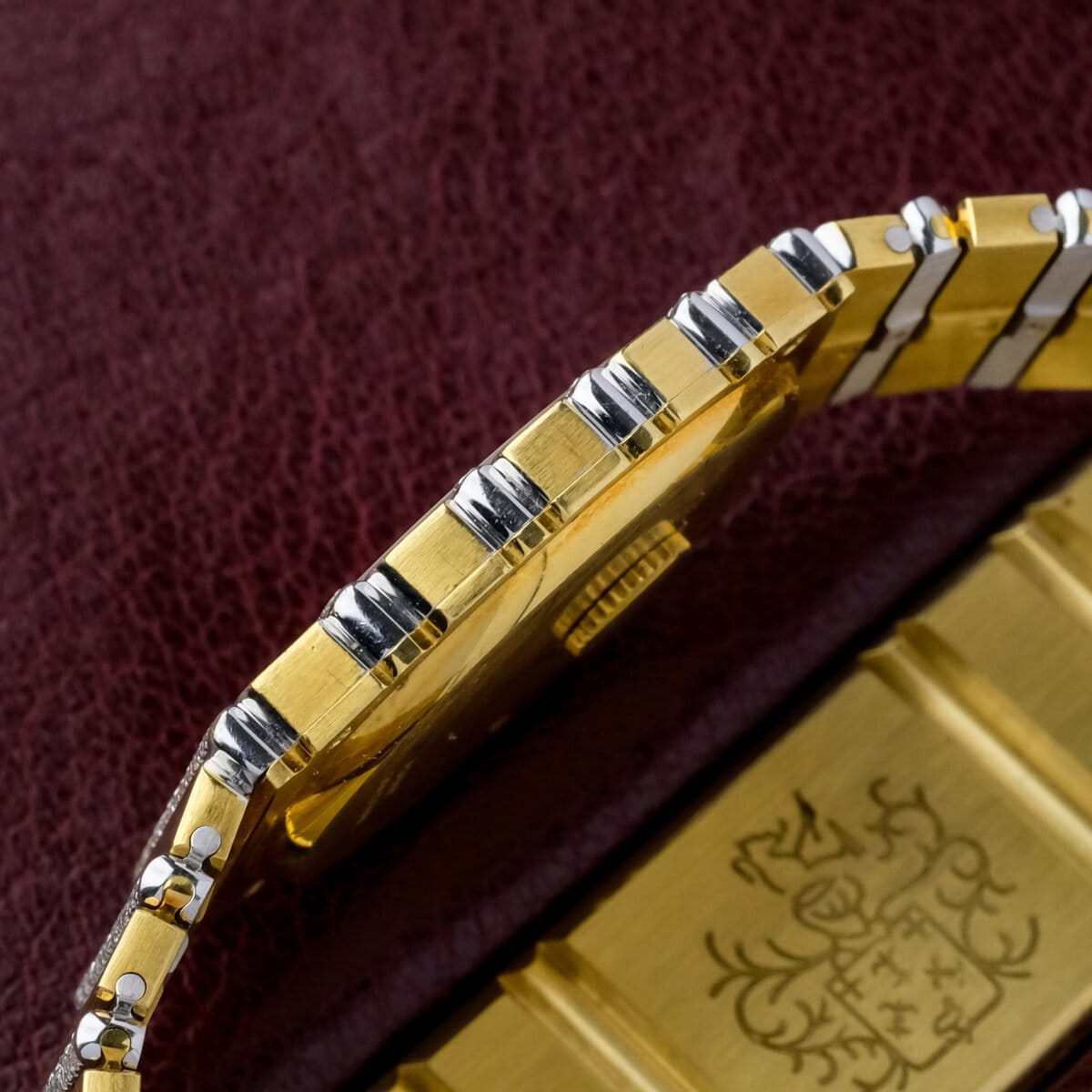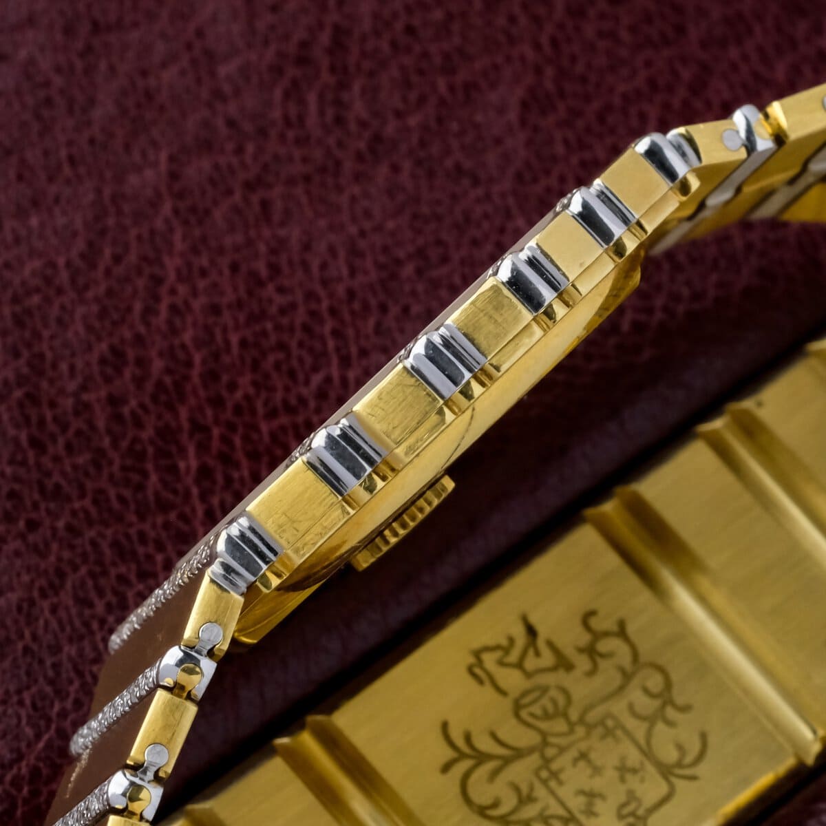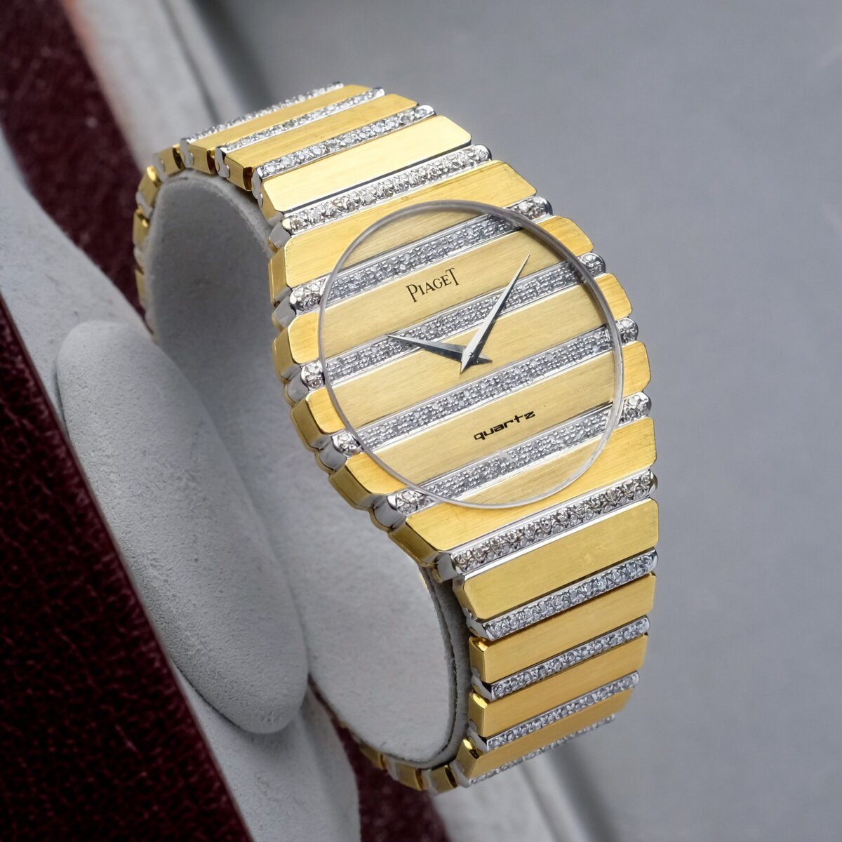 Piaget Polo reference 7661 in 18k yellow and white gold, measuring 34 millimeters and powered by a quartz movement. This rare variant features diamond set white gold sections integrated into the case, bracelet and dial, creating the distinctive high jewelry interpretation of the Polo design. The factory diamond setting is clean and uniform, and the watch remains in very good overall condition with well preserved surfaces and sharp transitions between the gold elements. The dial retains its original layout with matching diamond accents. Offered with its original Piaget box, this reference 7661 is an uncommon and highly decorative example of the vintage Polo line.