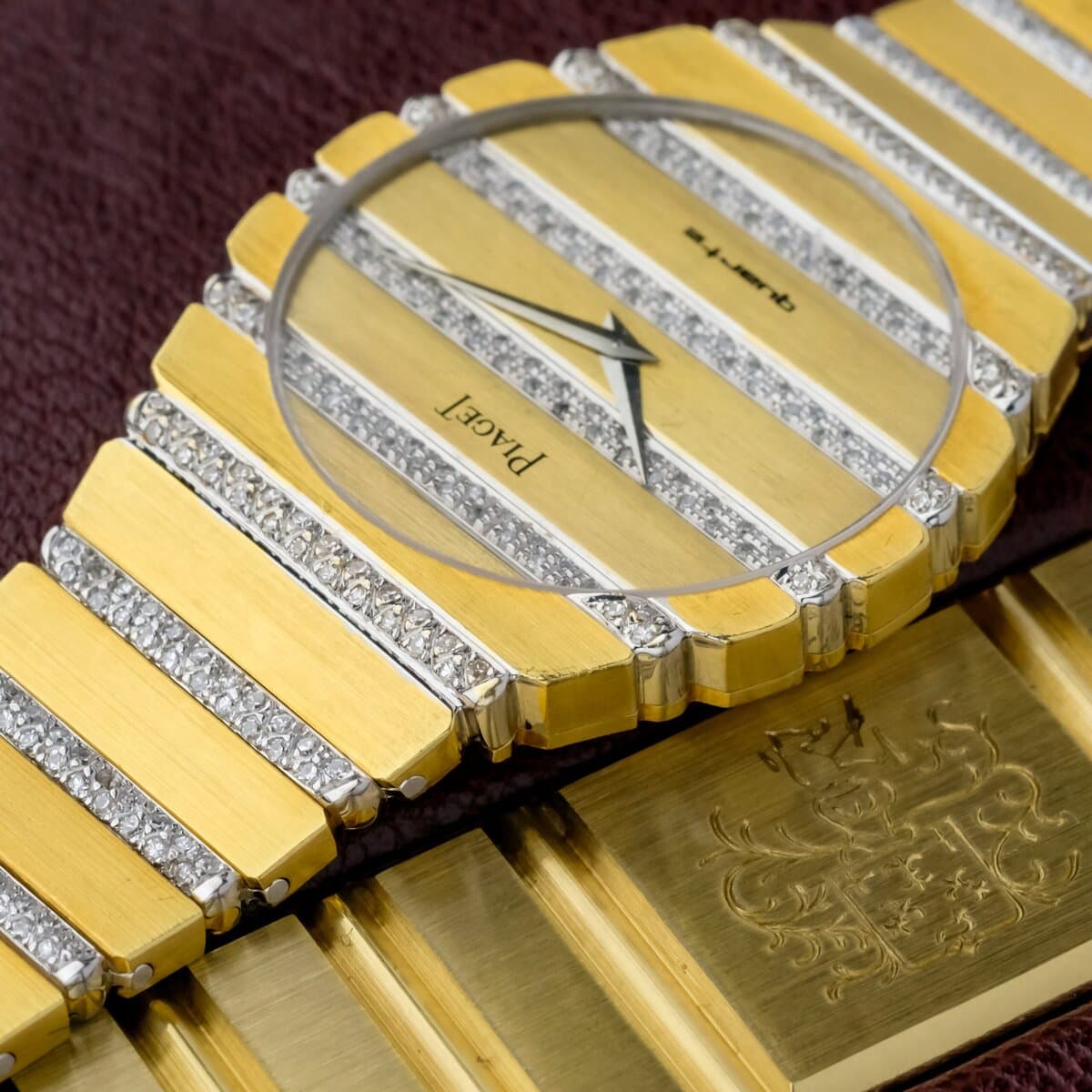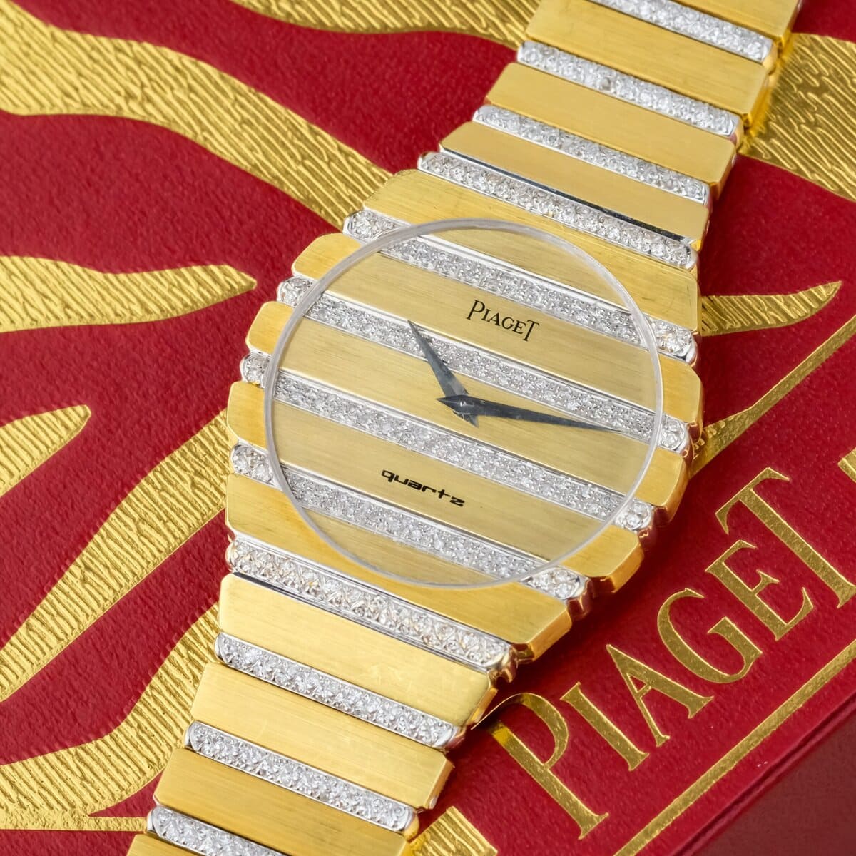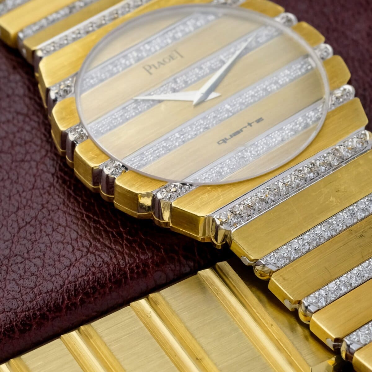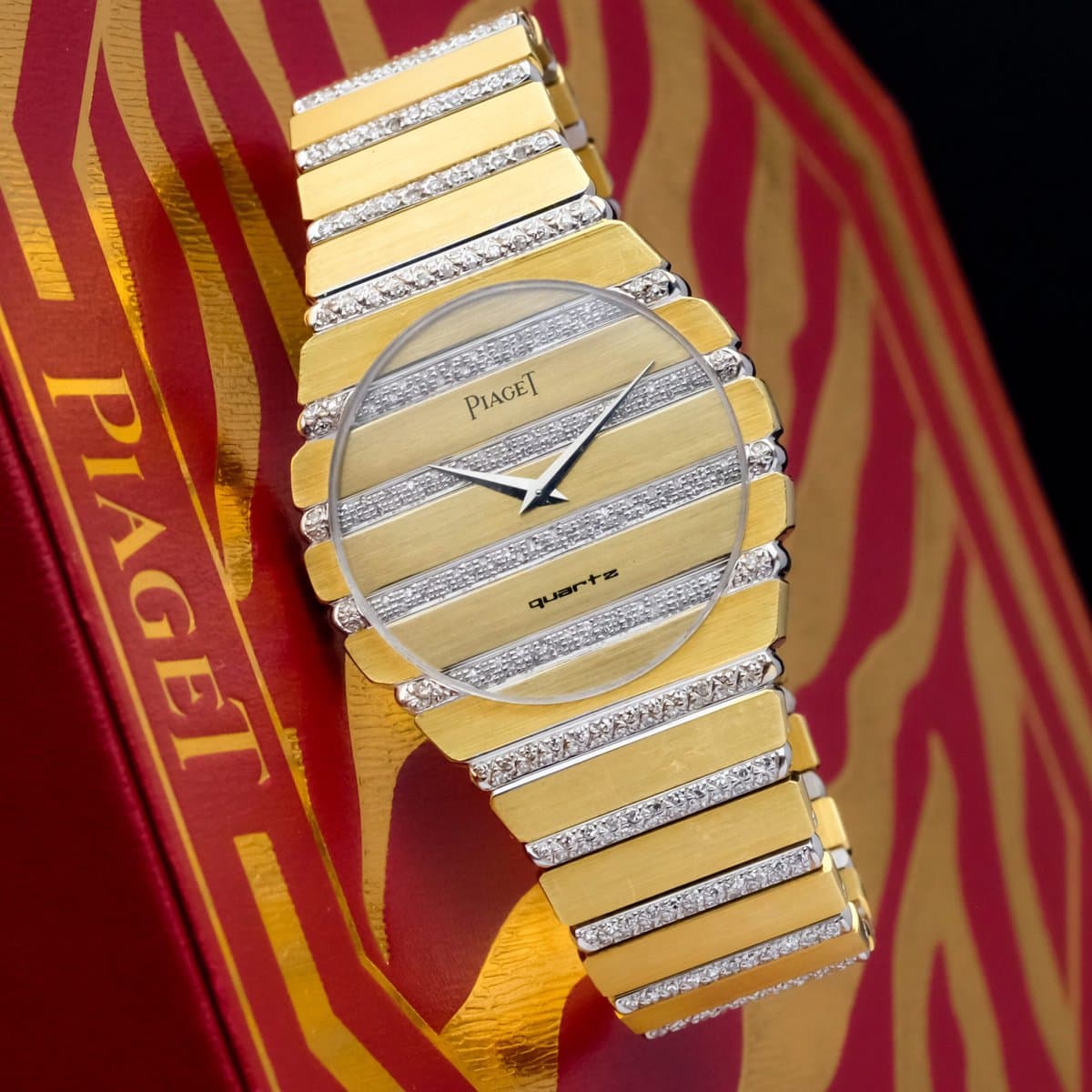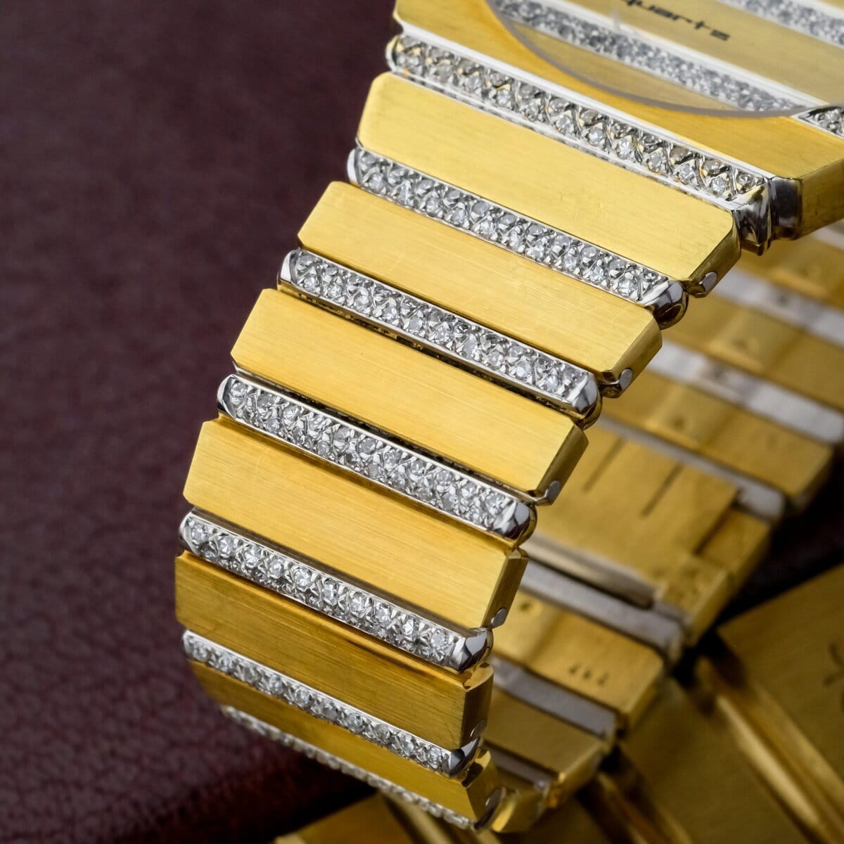 Piaget Polo reference 7661 in 18k yellow and white gold, measuring 34 millimeters and powered by a quartz movement. This rare variant features diamond set white gold sections integrated into the case, bracelet and dial, creating the distinctive high jewelry interpretation of the Polo design. The factory diamond setting is clean and uniform, and the watch remains in very good overall condition with well preserved surfaces and sharp transitions between the gold elements. The dial retains its original layout with matching diamond accents. Offered with its original Piaget box, this reference 7661 is an uncommon and highly decorative example of the vintage Polo line.