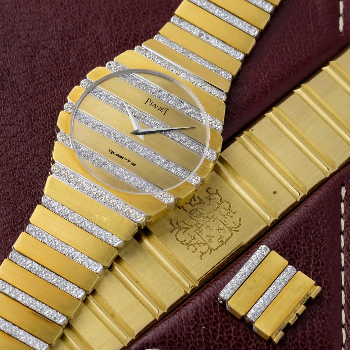 Piaget Polo reference 7661 in 18k yellow and white gold, measuring 34 millimeters and powered by a quartz movement. This rare variant features diamond set white gold sections integrated into the case, bracelet and dial, creating the distinctive high jewelry interpretation of the Polo design.